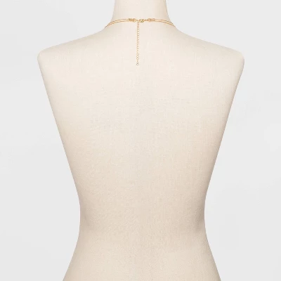 Step up your layering game with the Filigree Disc with Glitter Layered Necklace from A New Day™. This 19.3-inch gold-finish necklace features two chains in different styles atop one another for a lovely cascading effect. The upper layer is accented with frosty-white pearl and golden beads, while the lower layer has a disc pendant decked out in an ornate filigree pattern for eye-catching flair. This double-layered necklace is perfect for adding to any outfit of the day and it closes with a lobster-claw clasp at the back, where an extra length of chain makes the length fully adjustable.