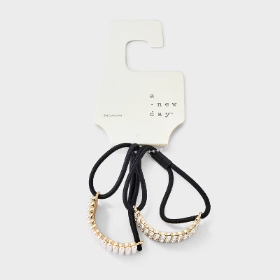 Add an instant touch of polish to your hairstyle with this 2-Piece Metal Rhinestone Cuff Hair Ponytail Elastic Set from A New Day™. This set includes two black ponytail holders with rectangular cuff accents — one studded with white faux pearls and the other with sparkly rhinestones — adding glam style while helping keep your hair neatly secured.