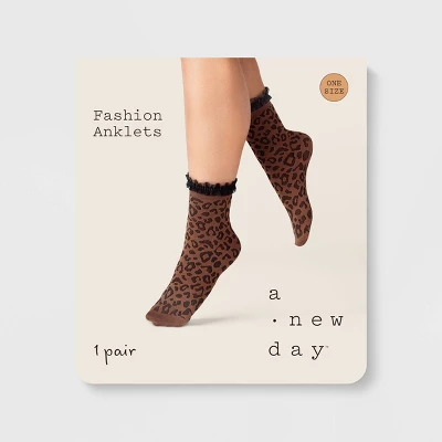 Step into style with these ruffle trim knit anklet socks, featuring a striking leopard spot pattern in a brown color. Crafted from a lightweight nylon and spandex blend, these socks offer a comfortable fit for sizes 4-10. The banded cuff ensures they stay in place, while the ankle height adds a trendy touch. Perfect for adding a pop of animal print to any outfit, these socks are a fun addition to your wardrobe.